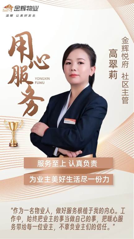 当阳光与生活交织,生活将更加灿烂;当服务与生活融合,生活将愈发美好。金辉物业人,用自己的点滴付出,为业主的生活添色彩、谱旋律,全力争做业主们的幸福使者。正是怀抱这样的初心,工作中涌现出许多优秀同仁,TA们恪尽职守、尽职尽责,以谦逊之心努力缔造美好。今天,让我们走近中国物业服务百强企业的一位社区主管——金辉悦府社区主管高翠莉,聆听属于她的故事……