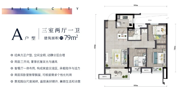建面约79㎡户型方正,动静合理分区;餐客厅一体化通透设计,无界实现互动交流,成为休闲聚会的理想之所;南向三开间让阳光毫无保留地倾洒入室;双卧室自带飘窗,阅读、观景、日光浴,让生活多一份闲适与浪漫;南向观景大阳台,巨幅宽幕亦可饱览优美景观于眼前。